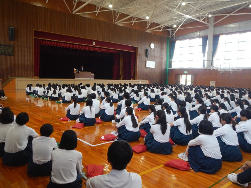 10月9日、月例会がありました。表彰伝達の後、陸上競技部の東海大会・全国大会に出る選手に向けて、壮行会が開かれました。 その後、後期生徒会役員選挙が行われました。立候補者の