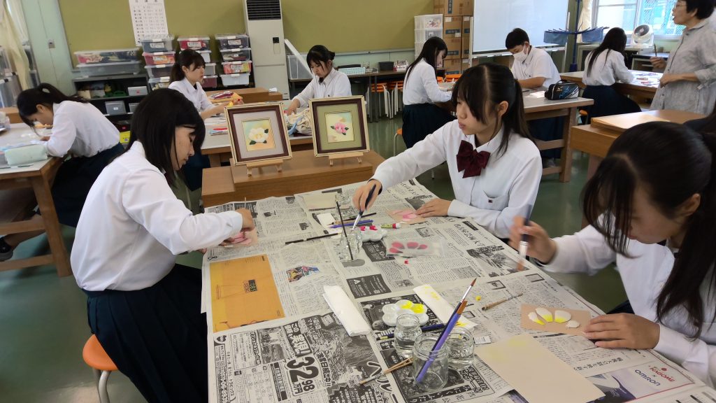 生徒それぞれの個性がでる椿の花の押絵が完成しました。